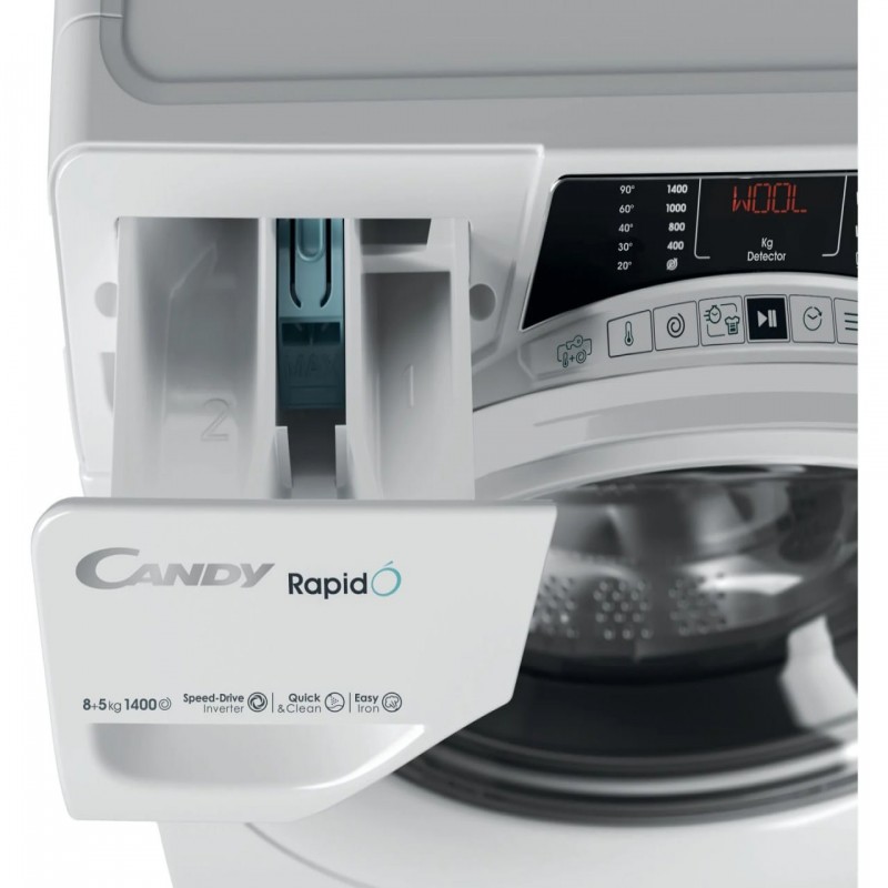 Kapacitet ove mašine za pranje i sušenje veša iznosi 8 KG za pranje i 5 KG za sušenje veša. Opremljena je sa centrifugom koja može dostići brzinu od 1400 obrtaja u minuti. Energetska klasa ove mašine je D/A. Poseduje inovativni SPEED-DRIVE inverterski motor koji pruža do 50% više mehaničke snage pranja u poređenju sa konvencionalnim modelima. QUICK & CLEAN tehnologija omogućava koncentrisano doziranje vode i deterdženta direktno na veš, čime se povećava efikasnost pranja, čak i pri nižim temperaturama. Vodena para dodatno osvežava veš i smanjuje gužvanje, smanjujući broj prevoja za do 80% nakon tretmana.