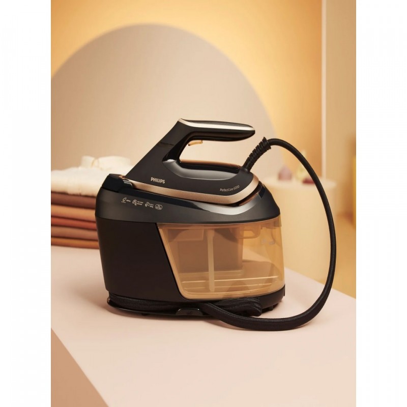 Pegla PerfectCare serije 6000 konstruisana je tako da obezbedi najbolje performanse peglanja parom, sada u potpuno obnovljenom, kompaktnom dizajnu. Uživajte u bržem peglanju i ne razmišljajte o tome koliko mesta pegla zauzima.