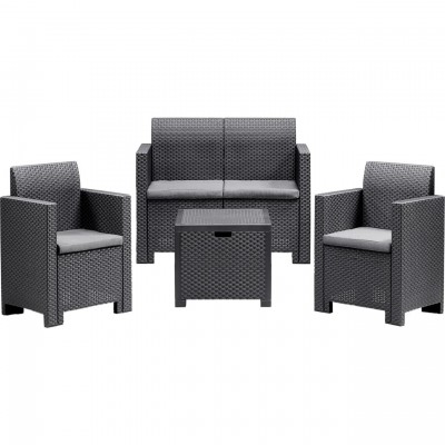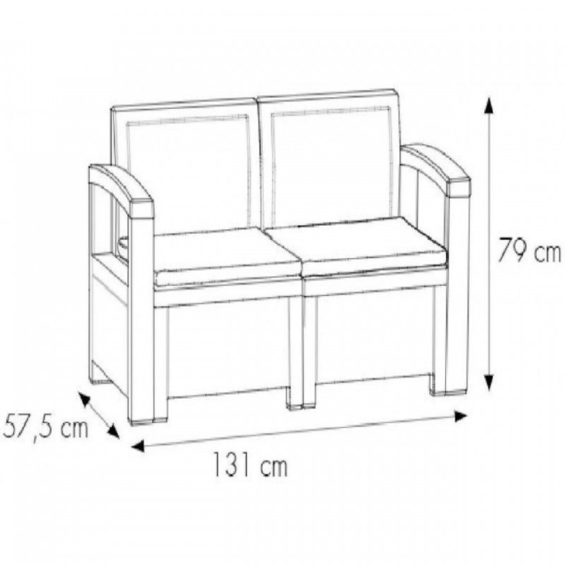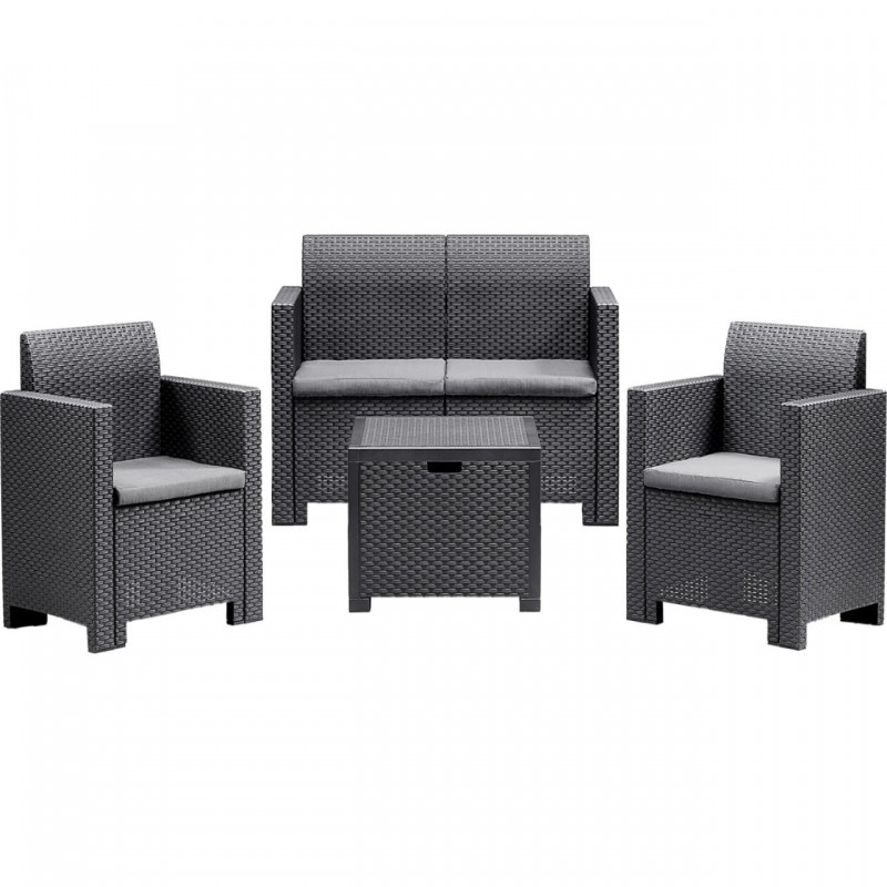 Set nameštaja za baštu: Sto, dvosed, dve fotelje, jastučići. Karakteristike Boja: Antracit/Siva Materijal: Polypropilen Dimenzije dvoseda:131 x 57.5 x 79cm Dimenzije fotelje: 75 x 57.5 x 79cm Dimenzije stola: 64 x 64 x 40cm Nosivost: 120kg po sedalnom mestu Težina: 47kg Mogućnost otvaranja stola Proizvedeno u Italiji. Napomena: Mogu se desiti minimalna odst...