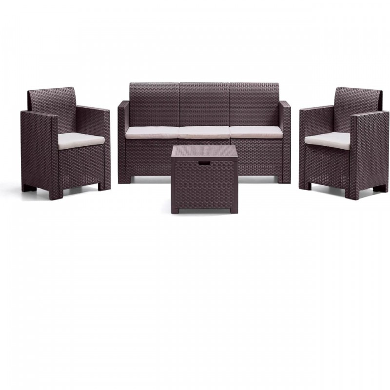 Set nameštaja za baštu sadrži: Sto Trosed Dve fotelje Jastučići Karakteristike Materijal: Polypropilen (plastika) Dimenzije (DxŠxV): Dimenzije troseda: 188 x 57.5 x 79 cm Dimenzije fotelje: 75 x 57.5 x 79 cm Dimenzije stola: 64 x 64 x 40 cm Nosivost: 120kg po sedalnom mestu Težina: 60 kg Dug život, bez znakova starenja! Proizvedeno u Italiji Napomena: Mogu ..
